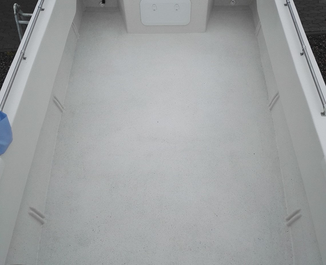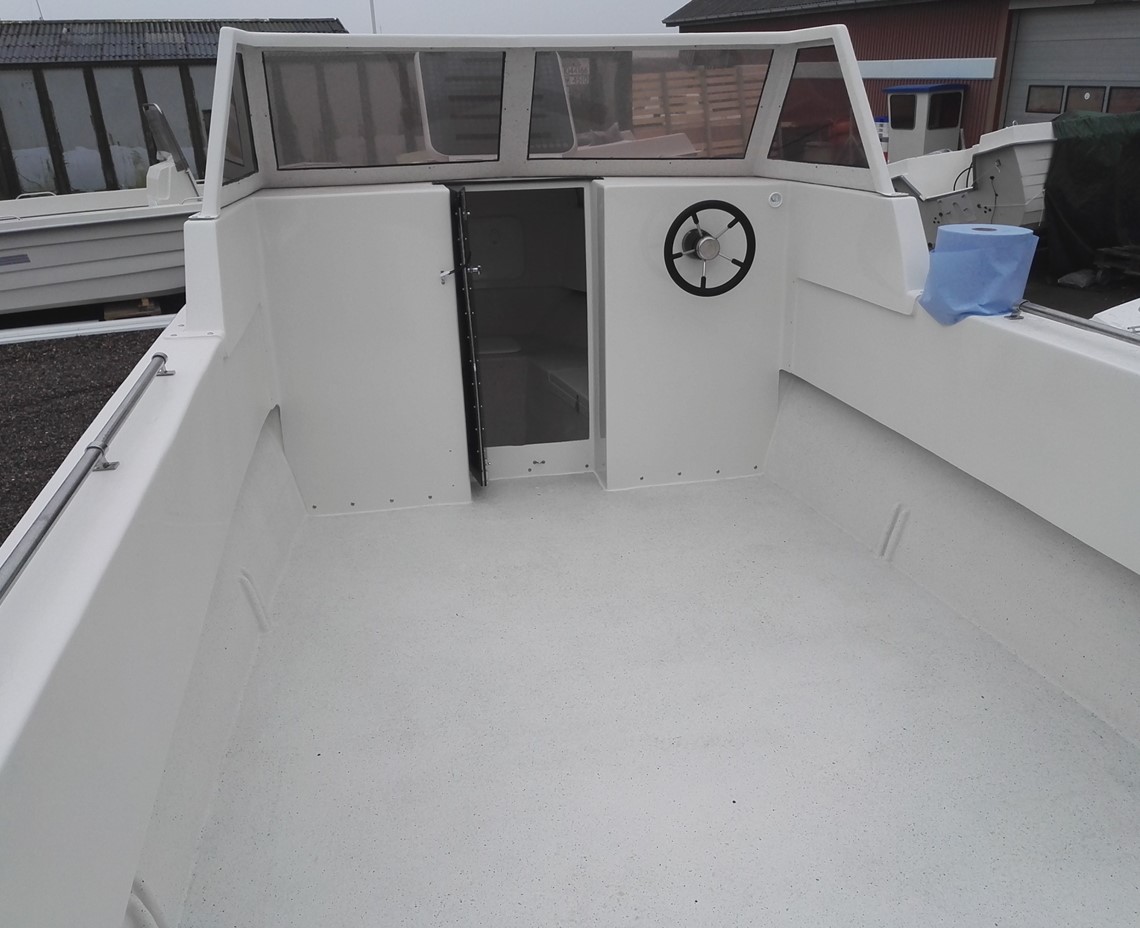 kan leveres med hardtop eller lukket kabine i front Godkendt til 350 HK... Med Suzuki 300 HK.. er topfarten ca. 45 knob. .. usædvanlig stabil båd som er godkendt til 3600 kg last. En båd som sejler helt perfekt, kan laste rigtig meget, altid stabil i søen...selvlænsende med stort arbejdsdæk og høj ræling af hensyn til sikkerhed